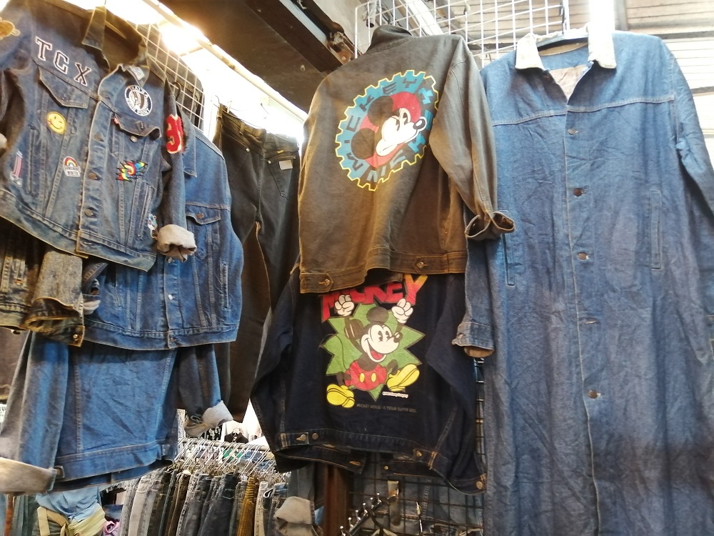 通路に所狭しと、古着が並んでしますが、高い所に並べてあるものは「看板商品」と言った物で、店の人が選別したお進め品であることが多く、古着のバイヤーはこれを手に取り買い付けをする決めたりします。