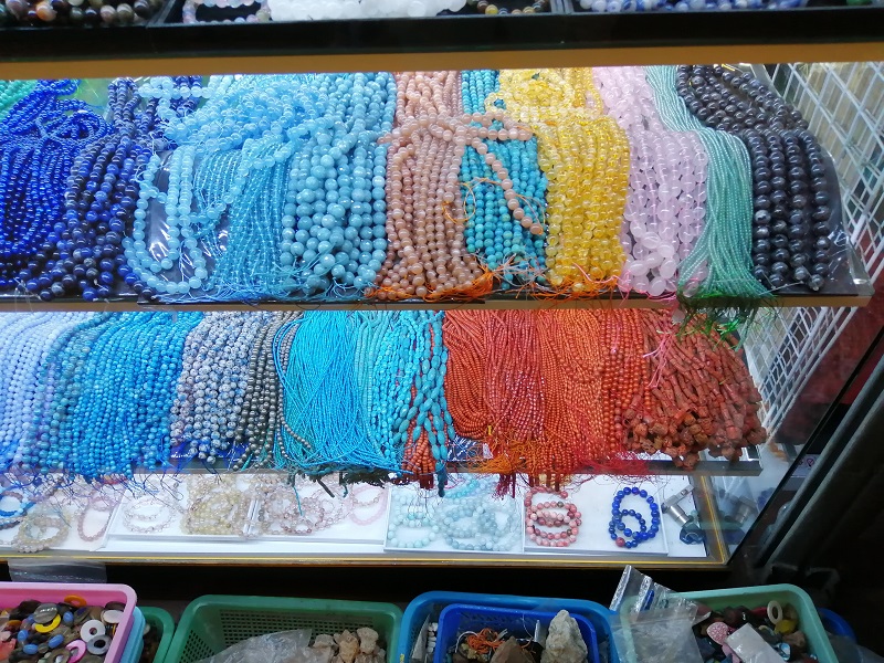 カラフルなバックや、アクセサリーや天然石のお店があります。